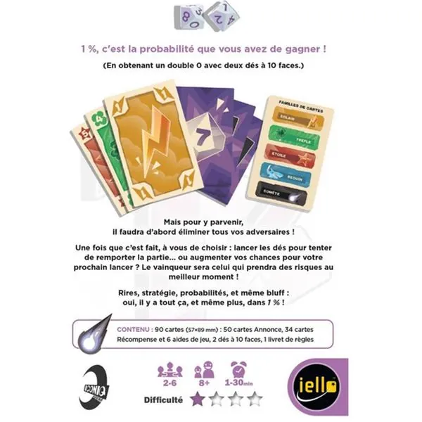 En conclusion, 1% est un jeu qui teste votre capacité à gérer le hasard et à élaborer des stratégies complexes. Il est parfait pour ceux qui cherchent à pimenter leurs soirées de jeu !