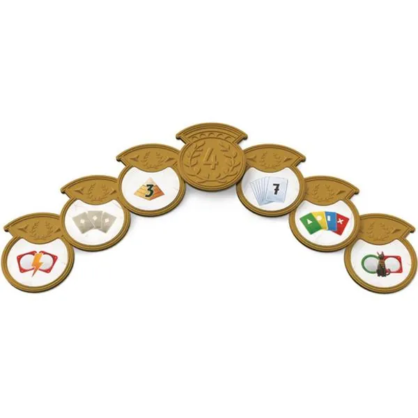 Vous y trouverez également de nouveaux jetons progrès (les jetons verts) ainsi qu’un nouvel élément, les médailles. Ce sont des objectifs à réaliser avant vos adversaires pour les gagner et rafler des points de victoire (avoir 3 cartes bleues en votre possession, avoir 7 cartes, avoir construit 3 étages de sa merveille, etc.).