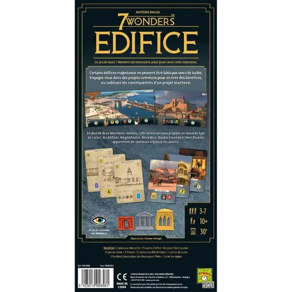 Mise en œuvre simple, sans prolonger les parties, avec une interaction supplémentaire par un projet commun et de nouveaux enjeux, « Edifice » est idéal pour bien débuter les extensions de 7 Wonders.