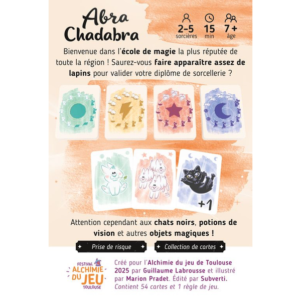 Abra Chadabra est un jeu de cartes familial où vous allez devoir prendre tous les risques pour obtenir votre diplôme de sorcellerie. Faites apparaître des lapins en choisissant la bonne carte parmi les 4 paquets classés de facile à chaotique. Mais attention aux chats noirs, potions de vision et autres objets magiques. Avec une mécanique simple et efficace accompagnée d'illustrations adorables, les parties s'enchaînent facilement pour le plus grand amusement de toutes et tous !