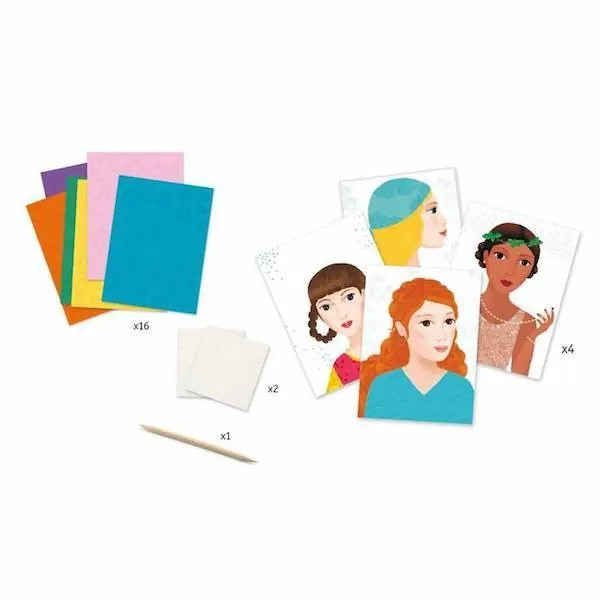 Avec ce coffret créatif, votre enfant va pouvoir réaliser 4 magnifiques tableaux en volume avec des fleurs en papier. Il devra les associer entre elles en fonction des couleurs ou en fonction de ses propres goûts, en les superposant pour créer des fleurs en relief. Il pourra ensuite les coller sur les visages de belles jeunes femmes.