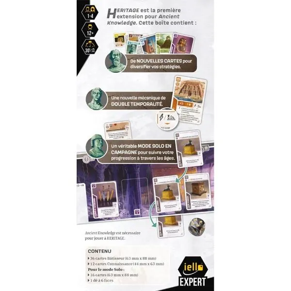 Les cartes Bâtisseur et Connaissance de cette extension ajoutent de nouvelles combinaisons et ouvrent de nouvelles opportunités stratégiques pour vos prochaines parties, aussi bien à plusieurs qu’en solo. Certaines cartes de cette extension ont des effets avec plusieurs temporalités.