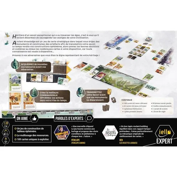 Ancient Knowledge est un jeu de cartes stratégique dans lequel vous érigez des monuments et construisez des artefacts. Votre but : transmettre vos connaissances à travers le temps. Ce dernier rendra en effet vos constructions éphémères, les condamnant peu à peu à l’oubli.
