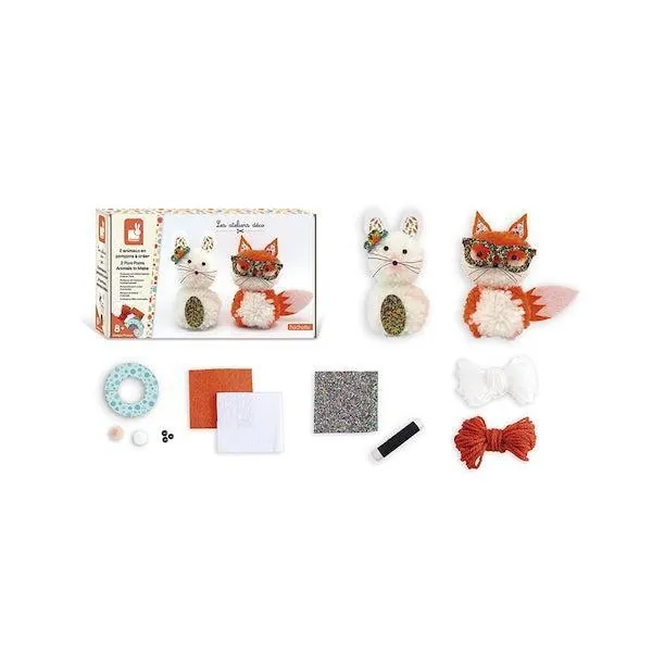 Ce kit créatif permet de réaliser un lapin et un renard en pompons.