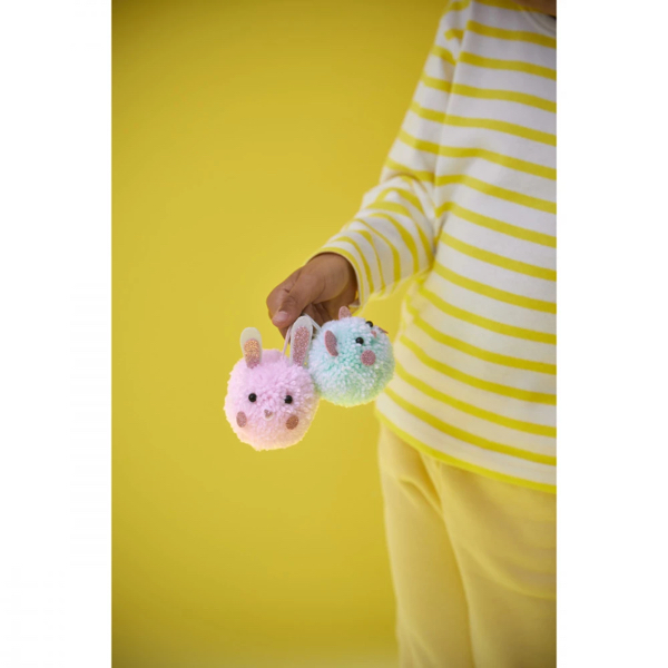 Une activité pompon simple, pour créer ses propres petites peluches : un lapin rose et un ourson bleu !
