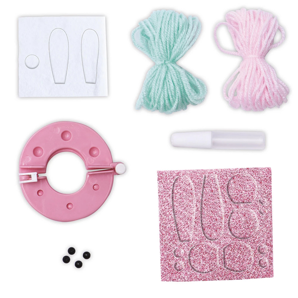 Contient : 2 grosses pelotes de laine, 1 planche de feutrine autocollante, 1 planche pailletée autocollante, des clous en plastique pour faire les yeux, 1 outil à pompon, 1 tube de colle transparente et 1 livret explicatif.