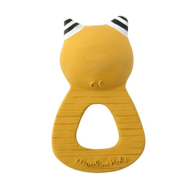 Le chat moutarde de la collection Les moustaches est un anneau en caoutchouc 100% naturel, issu de la sève d'Hévéa, à mordiller pour accompagner les premières dents de bébé.