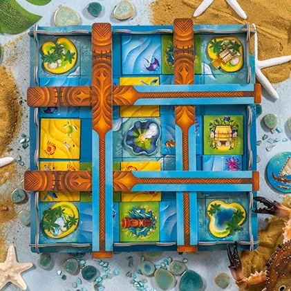 - Un bel effet visuel : grâce à un plateau central en 3D, une construction d’île sur 3 niveaux et des illustrassions chaleureuses et soignées.