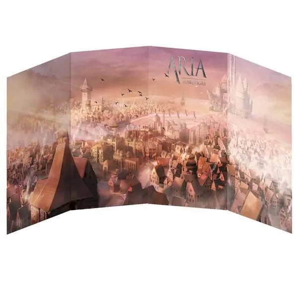 L’Écran de Jeu est en 4 volets A4 verticaux, avec une superbe illustration côté joueurs, et les tableaux essentiels côté MJ.
