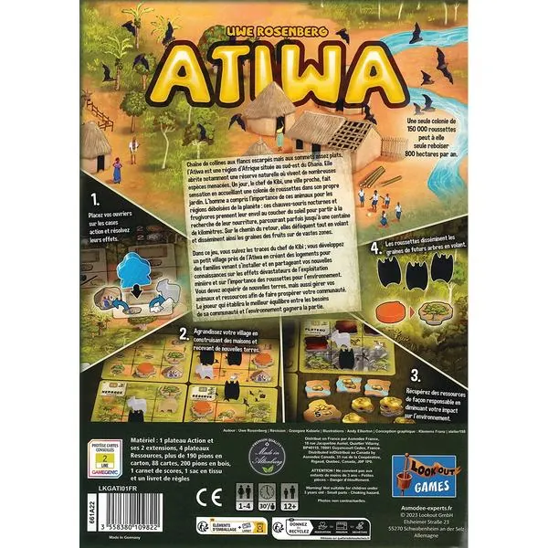 Dans Atiwa, vous allez développer une petite communauté près de la chaîne de montagnes Atiwa, en créant des logements pour les nouvelles familles. Mais vous allez devoir également partager vos nouvelles connaissances sur les effets négatifs de l’exploitation minière et l’importance des chauves-souris frugivores pour l’environnement. Comment ça marche : vous devez acquérir de nouvelles terres, gérer vos animaux et vos ressources, et faire prospérer votre communauté. Le joueur qui trouve le meilleur équilibre entre les besoins de sa communauté et l’environnement gagne.