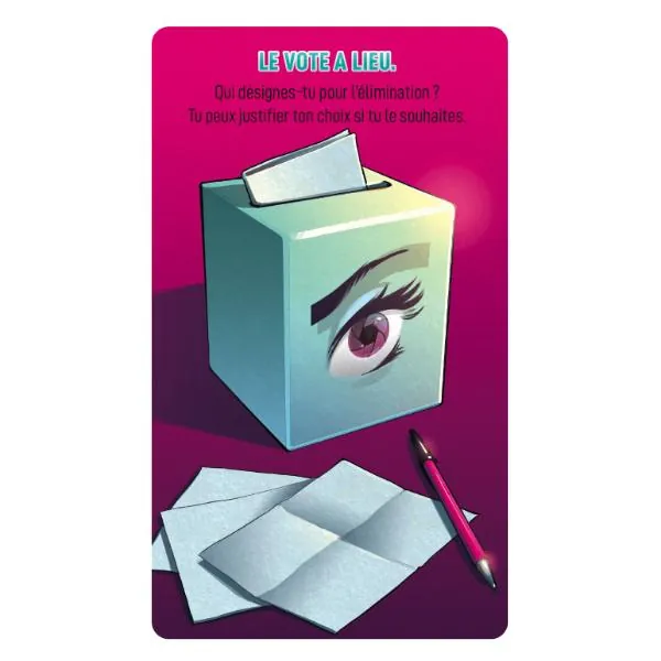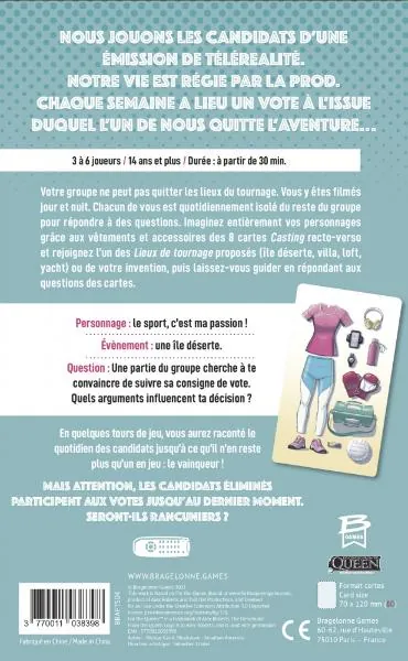 Rassemblez quelques amis et inventez tous ensemble une histoire pleine de rebondissements, en toute simplicité. Rejoignez le tournage d'une émission de téléréalité. Choisissez l’un des 4 lieux proposés et l’un des 8 sets d'accessoires avec lequel vous avez rejoint l'aventure, et laissez-vous guider en répondant aux questions des cartes. En quelques tours de jeu, vous aurez raconté un récit mêlant situations cocasses, entraides et trahisons, jusqu’à ce que ce qu'il ne reste qu'un seul participant, le vainqueur. Mais attention, les joueurs éliminés participent aux votes jusqu'à la fin de la partie.