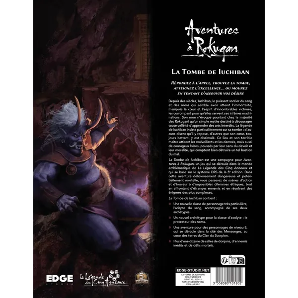 La Tombe de Iuchiban est une campagne pour Aventures à Rokugan, un jeu qui se déroule dans le monde emblématique de La Légende des Cinq Anneaux et qui se base sur le système DRS de la 5e édition.