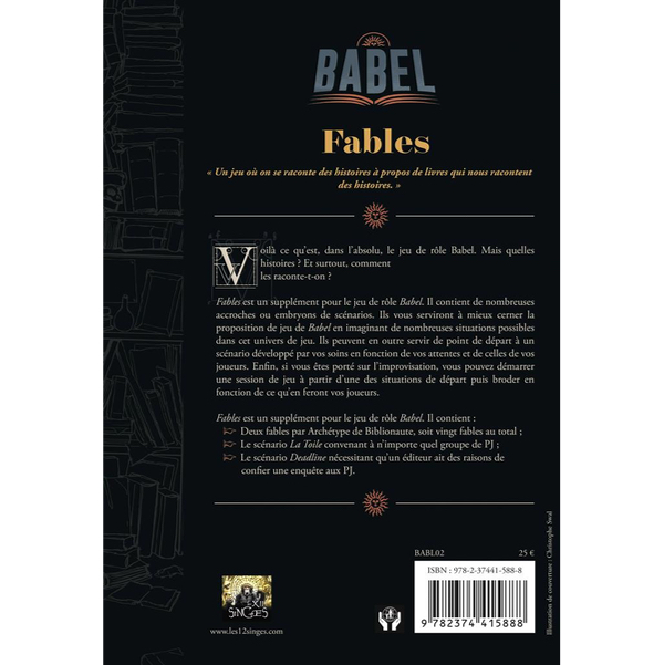 Ce supplément contient deux fables par Archétype de ludonaute, soit vingt fables au total ; le scénario La Toile, convenant à tout type de PJ, le scénario Deadline, nécessitant qu’un éditeur ait des raisons de confier l’enquête aux PJ.
