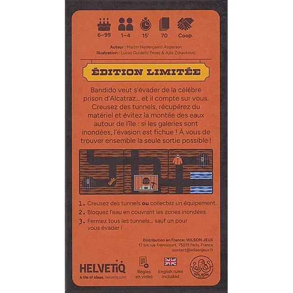 Dans ce jeu de coopération trépidant, les joueuses et joueurs aident le brigand à s'échapper. Mais prenez garde : il n'est pas facile de s'échapper d'Alcatraz ! Bandido a besoin de vous... et d'un bon équipement pour quitter le Rocher.