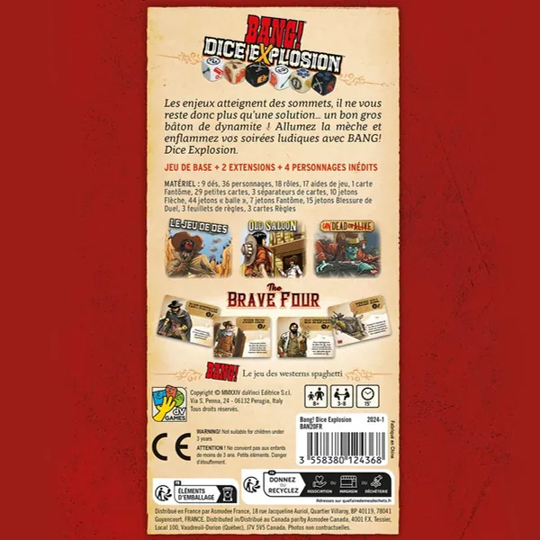 Une boîte tube évoquant un bâton de dynamite qui contient Bang le jeu de dés, ses deux extensions et du matériel supplémentaire !