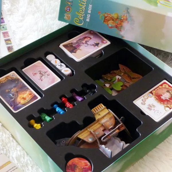 Cette Big Box rassemble tout le contenu existant autour de Celestia, et même plus : le jeu de base et ses 2 extensions (Coup de pouce et Coup de théâtre), la variante 2 joueurs imaginée par Bruno Cathala, 6 pions exclusifs Twinples, toutes les cartes et tuiles Cité goodies (dont la Cité de Noël, pour la première fois en version physique), des stickers descriptifs à placer sur les cartes Pouvoir et même du matériel exclusif pour personnaliser l'aéronef en 3D !