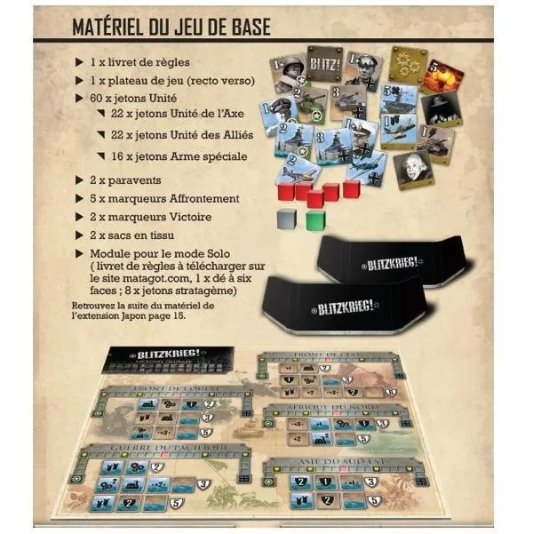 Entrez dans la Seconde Guerre Mondiale : incarnez la Coalition Alliée ou les puissances de l’Axe et affrontez-vous pour prendre le contrôle des principaux théâtres d’opérations ! Faites face à de nombreux choix décisifs ! Piochez des jetons Unité de votre sac pour déterminer votre force et compenser vos pertes. Une bonne perception du champ de bataille vous permettra d’allouer vos ressources militaires aux meilleurs postes pour les campagnes de chaque bataille décisive, vous assurant ainsi la victoire.