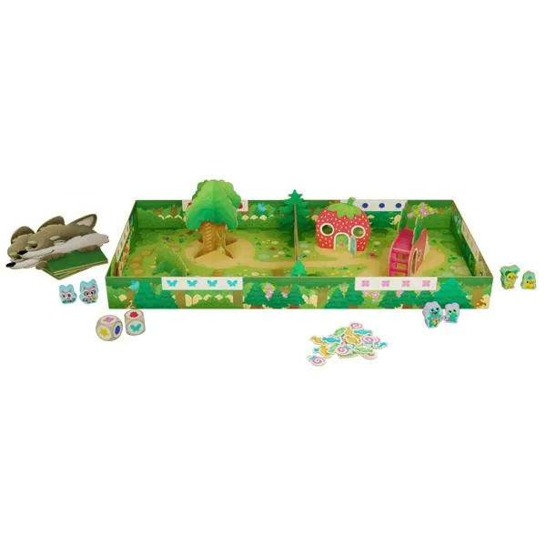 Contenu : 1 plateau Parc, 4 structures à construire, 2 sapins, 2 masques Loup, 8 pions Animaux, 60 jetons Bonbon, 2 dés Point de vue, 6 jetons Loup et 1 Règle du jeu.