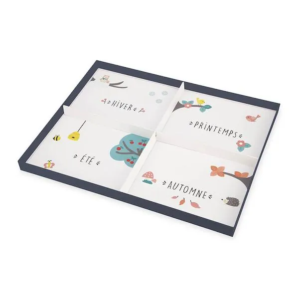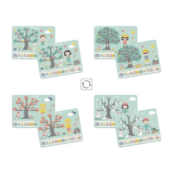 Ils pourront faire évoluer leur calendrier grâce aux 125 magnets représentatifs des 4 saisons. Les 4 cartes modèles recto-verso les aideront dans leur apprentissage.