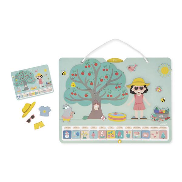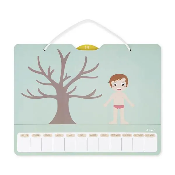 En plus, 12 aimants "mois" joliment illustrés permettent également d'assimiler la chronologie d'une année et de s'y repérer grâce à un aimant curseur. Sur le dessus du tableau, on retrouve une roue qui permet d'indiquer la saison.