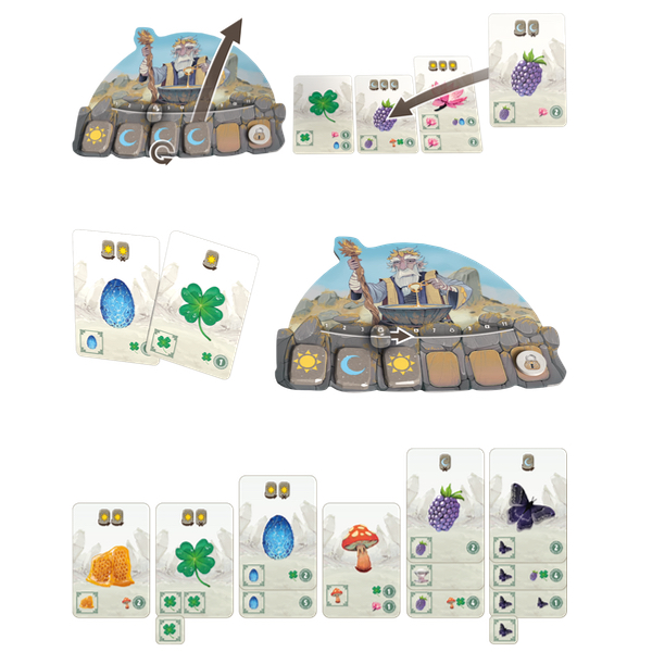 Utilisez vos runes Soleil et Lune pour payer les coûts d’ingrédients, formez des colonnes cohérentes, et progressez sur votre piste pour débloquer des bonus. Les cartes apportent des points selon les ingrédients qu’elles contiennent et leur position dans la recette. Des effets spéciaux (joker, cartes doubles…) viennent pimenter la stratégie.