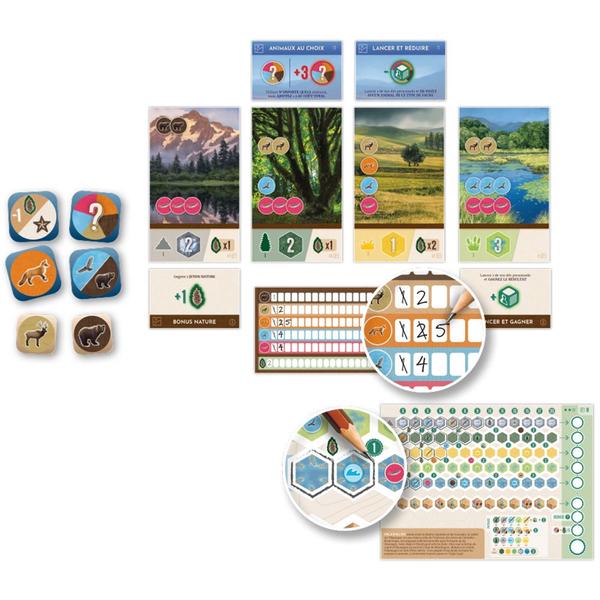 Lancez simultanément des dés, collectez des animaux sauvages et complétez des cartes d’habitat pour remplir les différents environnements de Cascadia. Utilisez des actions spéciales pour manipuler vos dés et des cartes de complétion dynamiques pour débloquer de puissantes combinaisons ! Bien que les règles de base soient simples, chaque feuille d’environnement unique a ses propres particularités, de sorte qu’il n’y a pas deux parties de Cascadia : Rolling ne se déroulera pas de la même façon.