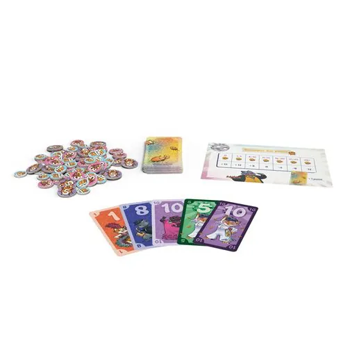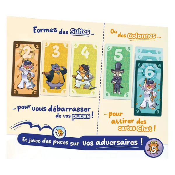 Jouez vos cartes astucieusement pour récupérer des points avec des cartes Chats, vous débarrasser de vos jetons Puces ou en redonner à vos adversaires. Dès qu’un joueur ou une joueuse n’a plus de Puces ou que la pioche est vide, la partie prend fin. Ayez le plus de points pour remporter la partie.