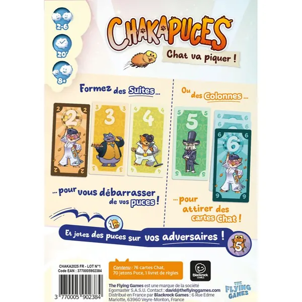 À chaque tour, jouez vos cartes pour créer des suites et vous débarrasser de vos Puces, ou formez des colonnes pour gagner des cartes précieuses. Mais attention aux Chakapuces, qui viennent semer la pagaille chez vos adversaires !