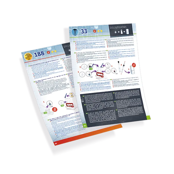 Inclus : 1 bécher, 1 éprouvette, 1 fiole, 3 tubes à essai, 3 bouchons, 1 bouchon avec trou + 1 tube flexible, 3 boîtes de Petri, 1 cuillère bleue, 1 cuillère jaune, 1 pince, 1 loupe, 1 thermomètre, 1 pipette, 1 goupillon, 1 ficelle, 1 ballon, 2 pailles, papier filtre, lunettes de protection, papiers pH.