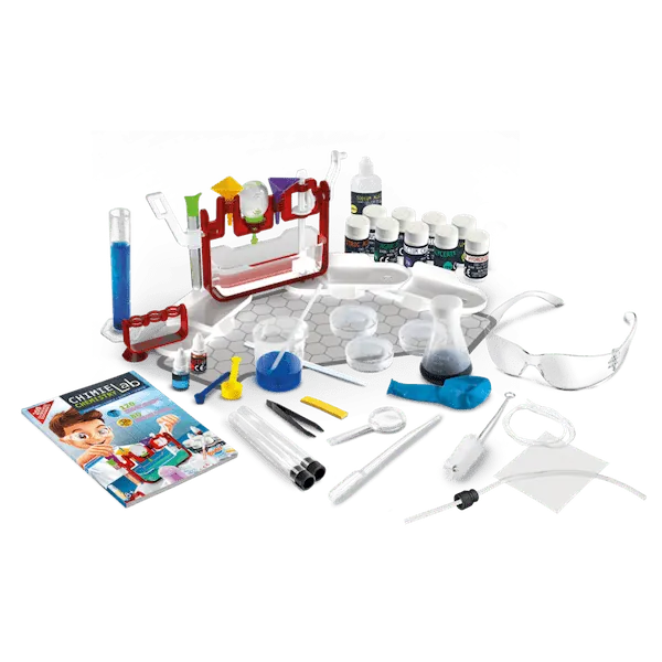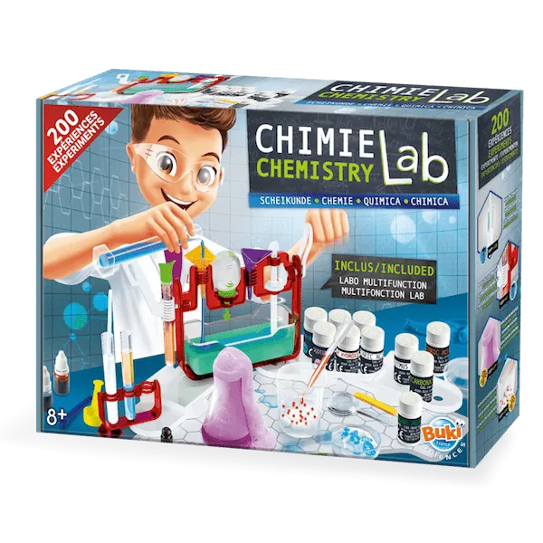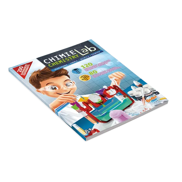 Chimie Lab est un coffret contenant 200 expériences (120 expériences sérieuses et 80 expériences amusantes ) à réaliser avec des ingrédients de la cuisine donc sans danger : densité, mélanges, acidité, réactions acide-base...