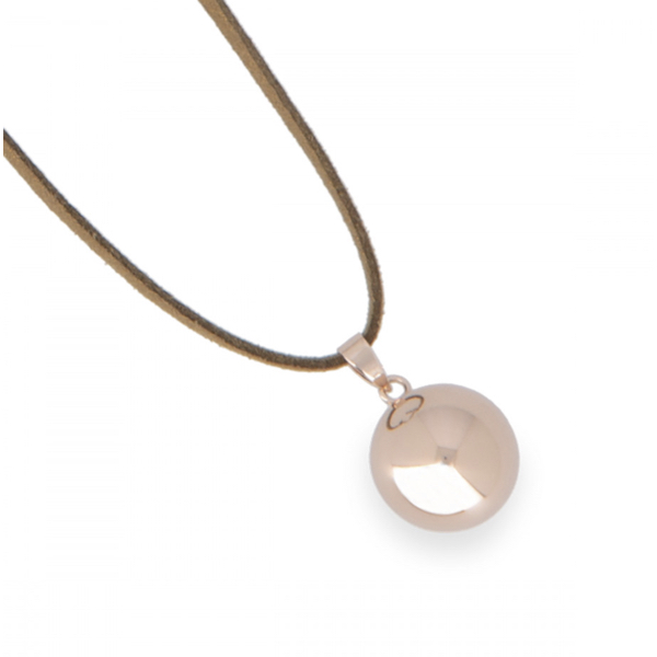 Le bola mesure 45 à 70 cm de long et se compose d’un collier en suédine ainsi que d’un pendentif en laiton, couleur or rosé (diamètre 2 cm).