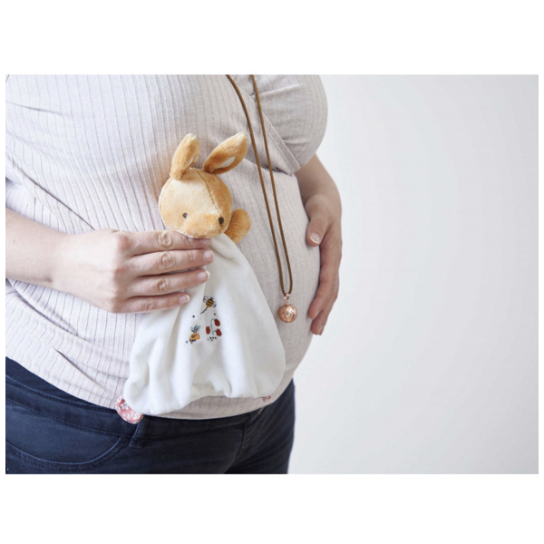 Ce coffret sur le thème de la comptine "Mon petit lapin", se compose d’un magnifique collier bola pour la maman et d’un adorable doudou lapin avec bola intégré dans la tête pour bébé.