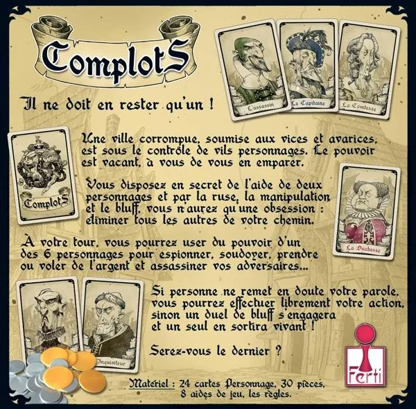 Vous disposez en secret de l’aide de deux personnages et par la ruse, la manipulation et le bluff, vous n’aurez qu’une obsession : éliminer tous les autres de votre chemin.
