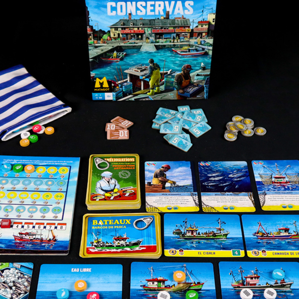 Dans chaque partie de Conservas, vous commencez chaque saison avec un seul bateau et un peu d'argent. La mer est représentée par un sac de jetons contenant des tuiles de poissons et d'eau. À chaque tour, vous pêcherez dans ce sac, en ramenant certains à votre établissement pour les mettre en boîte et en laissant d'autres se reproduire en mer.