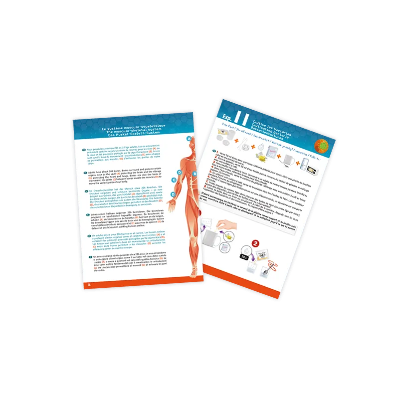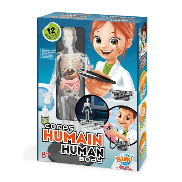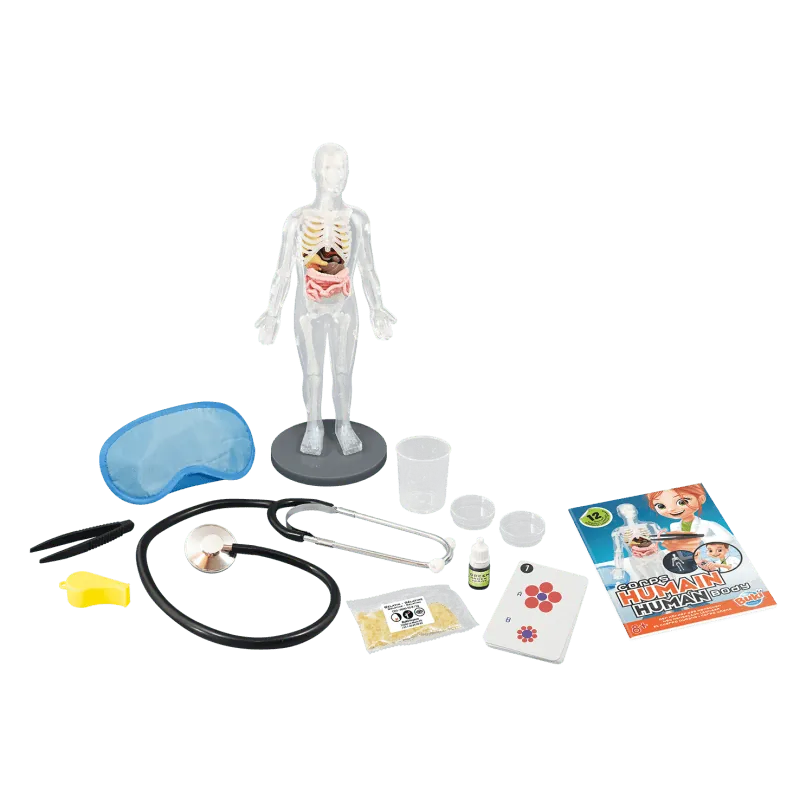 Inclus : 1 modèle de corps avec 9 organes, 1 squelette (12 pièces), structures transparentes, 1 base, 1 stéthoscope, 1 colorant vert (5 ml), 1 sifflet, 1 bandeau, 3 boîtes de Petri, 1 gobelet, gélatine (5 g), 1 pince, 10 cartes Illusions Optiques, 1 Notice illustrée.