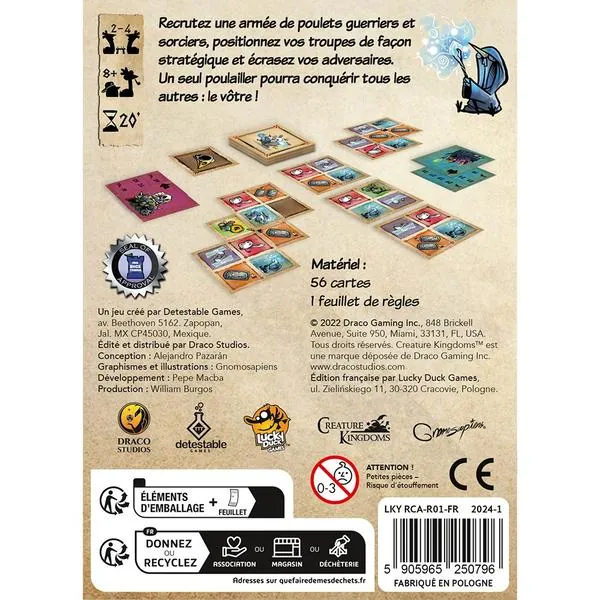 Vos valeurs d’attaque et de défense – en combat physique ou magique – sont déterminées par le nombre de poulets du type correspondant placés côte à côte sur votre grille. Les joueurs s’affrontent ensuite pour tenter de réduire à 0 les points de santé de leurs ennemis. La victoire est remportée par l’ultime survivant, ou par le joueur qui détient le plus de points de santé au moment où la fin de partie est déclenchée