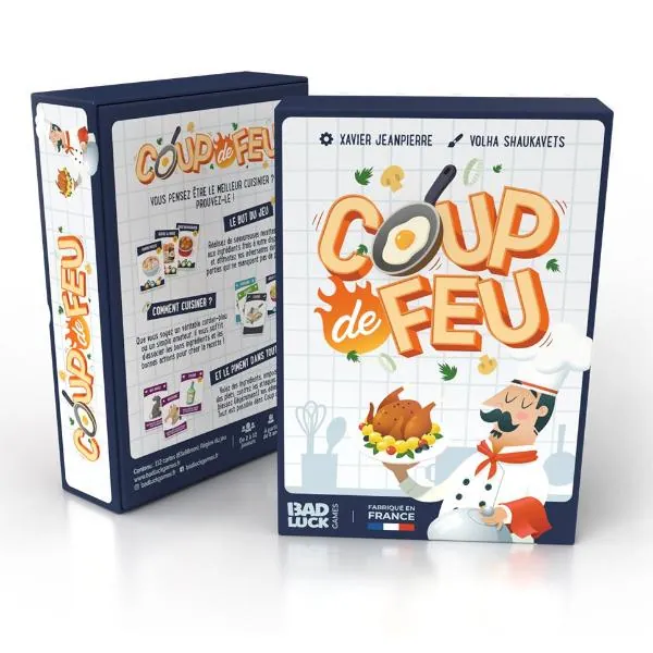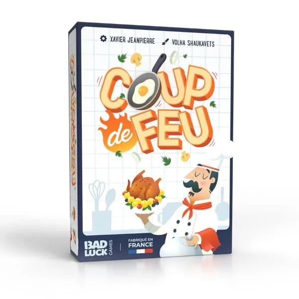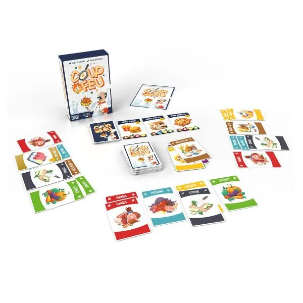 Dans "coup de feu", incarnez un cuisinier qui souhaite prouver aux autres "cuistots" de seconde zone, que son établissement et celui où l'on mange le mieux. Pour se faire, vous allez de voir vous mettre aux fourneaux pour cuisinier de savoureux plats, le plus rapidement possible. Chaque recette réalisée vous rapporte un nombre de points. Le premier cuisinier qui a 12 points remportera la partie. Il vous faudra alors rassembler les bons ingrédients, en cuire certains, en couper d'autres en espérant qu'un de vos adversaires ne réalise pas la recette que vous visiez avant vous.