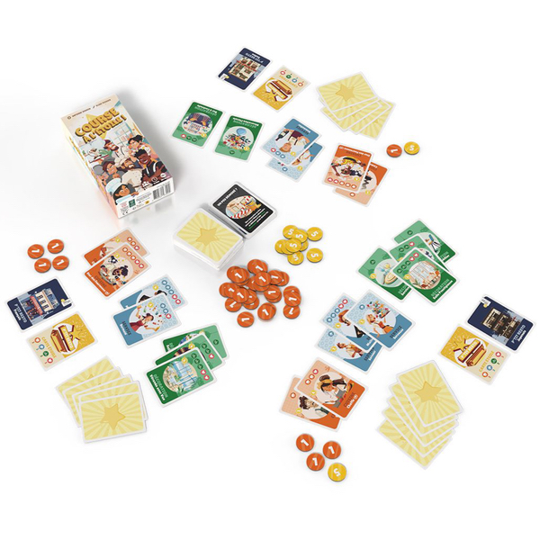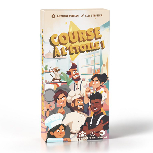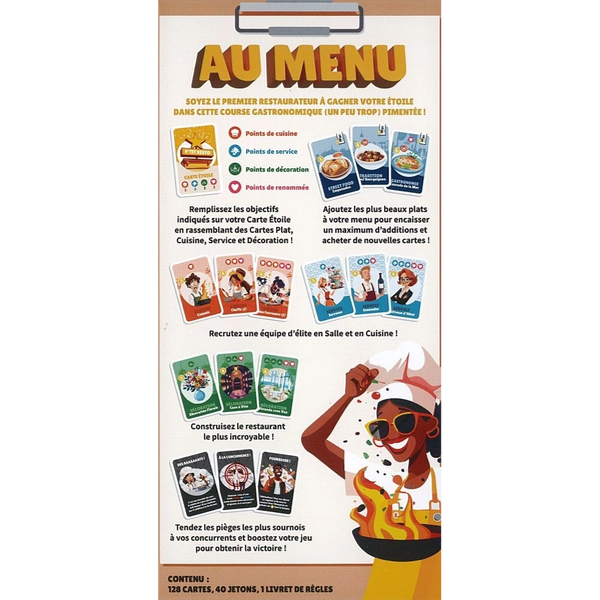 Pour cela, vous devez enrichir votre menu avec des plats savoureux, embellir vos locaux avec une décoration soignée et recruter une équipe talentueuse pour assurer un service impeccable. À la fin de chaque tour, vous gagnez de l’argent en fonction des plats servis dans votre établissement. Ce capital vous permettra d’investir, au tour suivant, dans de nouveaux éléments pour faire prospérer votre restaurant. Le premier joueur à remplir les conditions de sa Carte Étoile remporte la partie.