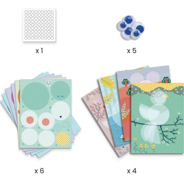 Contient : 4 cartes illustrées, 6 feuilles de ronds papier illustrées et prédécoupées en forme de cercle, 5 yeux mobiles, 1 planche d'autocollants double face et 1 livret explicatif en couleur.