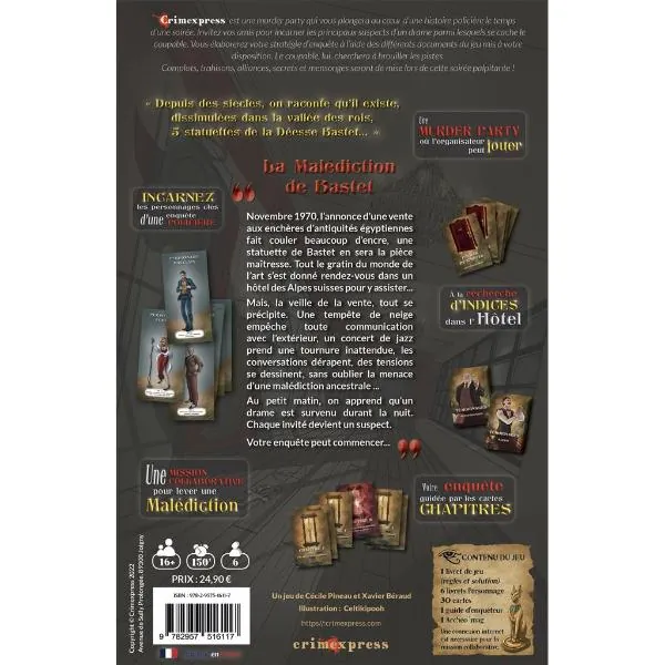 La Malédiction de Bastet est la seconde murder party clé en main de Crimexpress après Meurtre à Saciney. Elle est prévue pour 6 joueurs et fournit tout le matériel nécessaire, personnages, livret indices, etc. pour passer une soirée inoubliable.