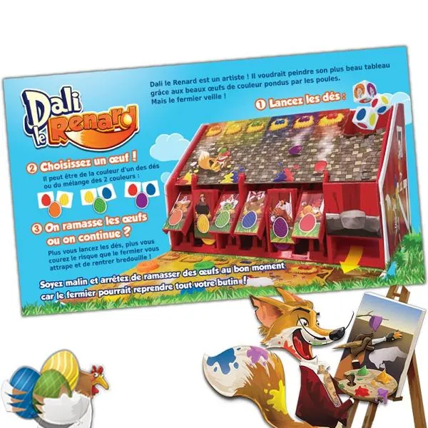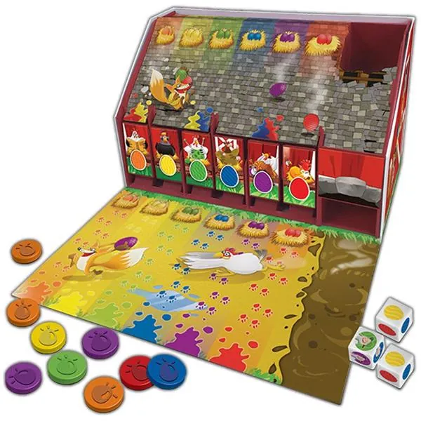 Lancez les dés dans le poulailler ! Ils indiquent quels oeufs vous pouvez choisir et lequel est interdit (car le fermier veille).