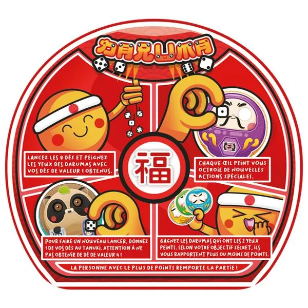 Ces derniers rapportent plus ou moins de points selon votre objectif secret. Pour obtenir ces darumas, vous devez « peindre » leurs yeux en y plaçant uniquement des dés de valeur 1 obtenus durant votre tour de jeu.