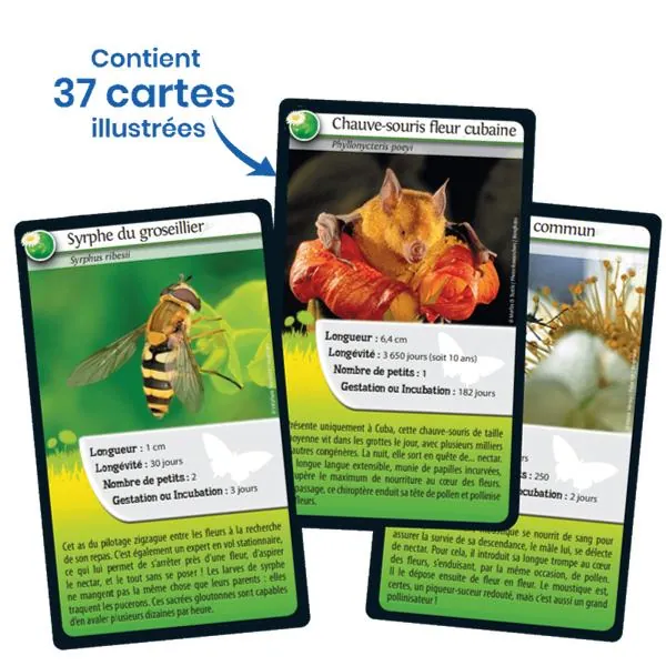 Défis Nature - Abeilles et autres pollinisateurs vous emmène à la rencontre des abeilles et d'autres animaux pollinisateurs ! Découvrez les espèces à préserver, puis pariez sur les points forts de vos animaux pour collecter toutes les cartes du jeu et remporter la partie.