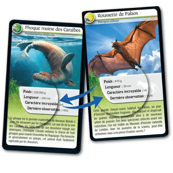 Défis Nature - Animaux disparus vous emmène à la rencontre des animaux récemment disparus ! Découvrez leurs caractéristiques, puis pariez sur les points forts de vos animaux pour collecter toutes les cartes du jeu et remporter la partie. Alors, prêts à relever le défi ?