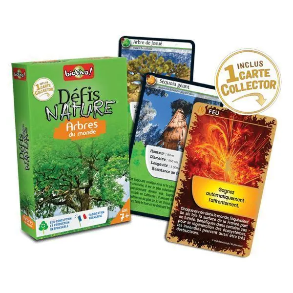 Défis Nature - Arbres du monde vous emmène à la rencontre des plus beaux arbres du monde ! Découvrez les espèces à préserver, puis pariez sur les points forts de vos arbres pour collecter toutes les cartes du jeu et remporter la partie. Alors, prêts à relever le défi ?