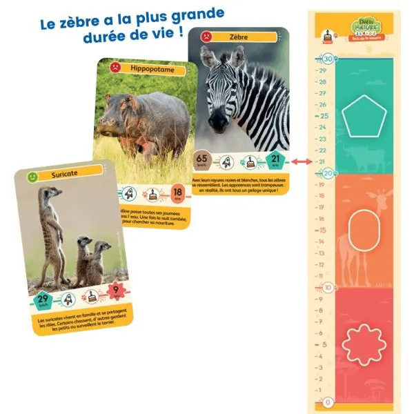 Défis Nature Junior - Rois de la savane est le jeu parfait pour découvrir les animaux de la savane mais aussi commencer l’apprentissage des nombres grâce aux deux niveaux de jeu de la toise.