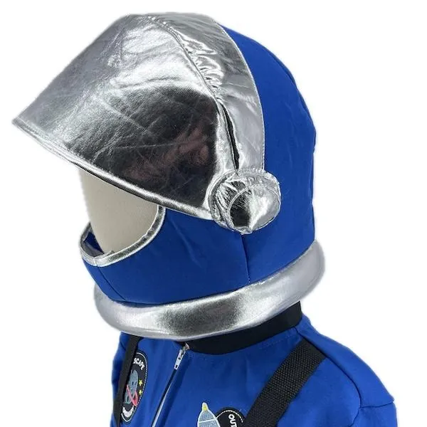 Une superbe combinaison de cosmonaute bleue, très réaliste, avec impression de badges, fermeture par zip et casque de cosmonaute en mousse.