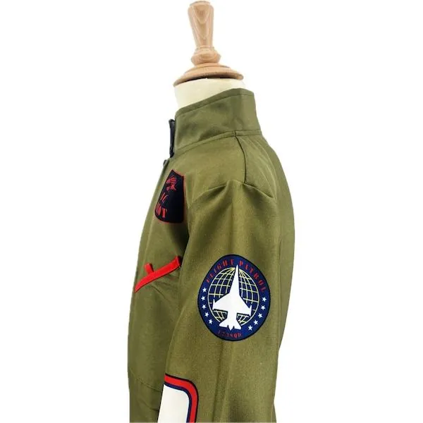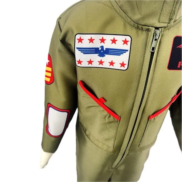 Une belle combinaison de pilote en coton, avec impression de badges faisant référence aux emblèmes des pilotes de chasse, fermeture par zip, équipée de poches pour y glisser des accessoires...