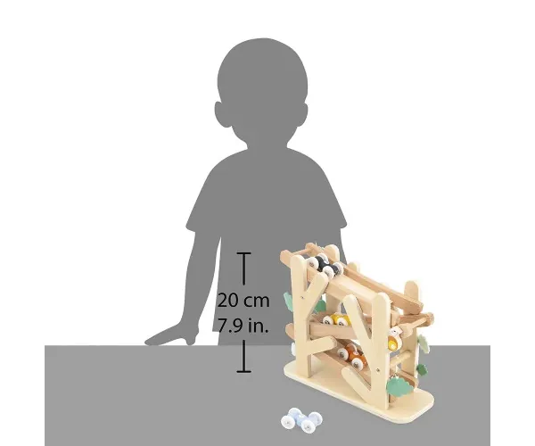 Chacune leur tour, les fourmis s’élancent du haut de la colline, déboulent en trombe dans les feuillages, pour finir leur course en fanfare grâce à la clochette située au bout du parcours. Les enfants ne se lasseront pas de poser leur fourmi préférée tout en haut pour l’observer descendre encore et encore sur 3 niveaux !