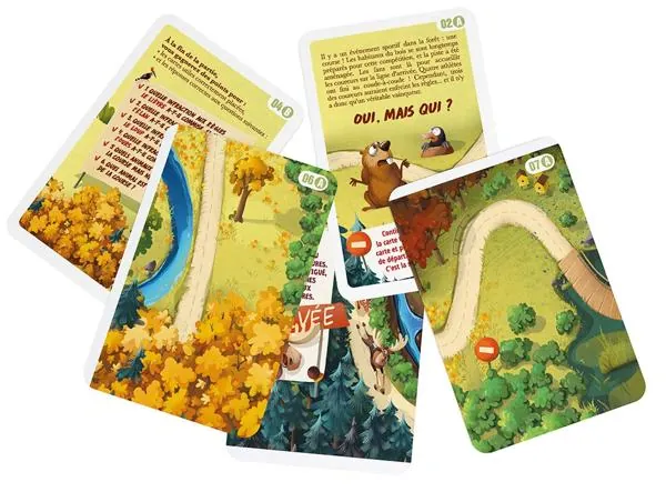 Parlez aux animaux de la course et découvrez ce qu'ils savent ! Attention aux fausses pistes, vous devez décider quelles cartes peuvent vous aider à résoudre l'affaire de cette mystérieuse triche... Les joueurs choisissent les cartes et les assemblent pour dresser un tableau complet de ce qui est arrivé. Vous devrez répondre à quelques questions et décrire ce qui s'est passé et pourquoi.
